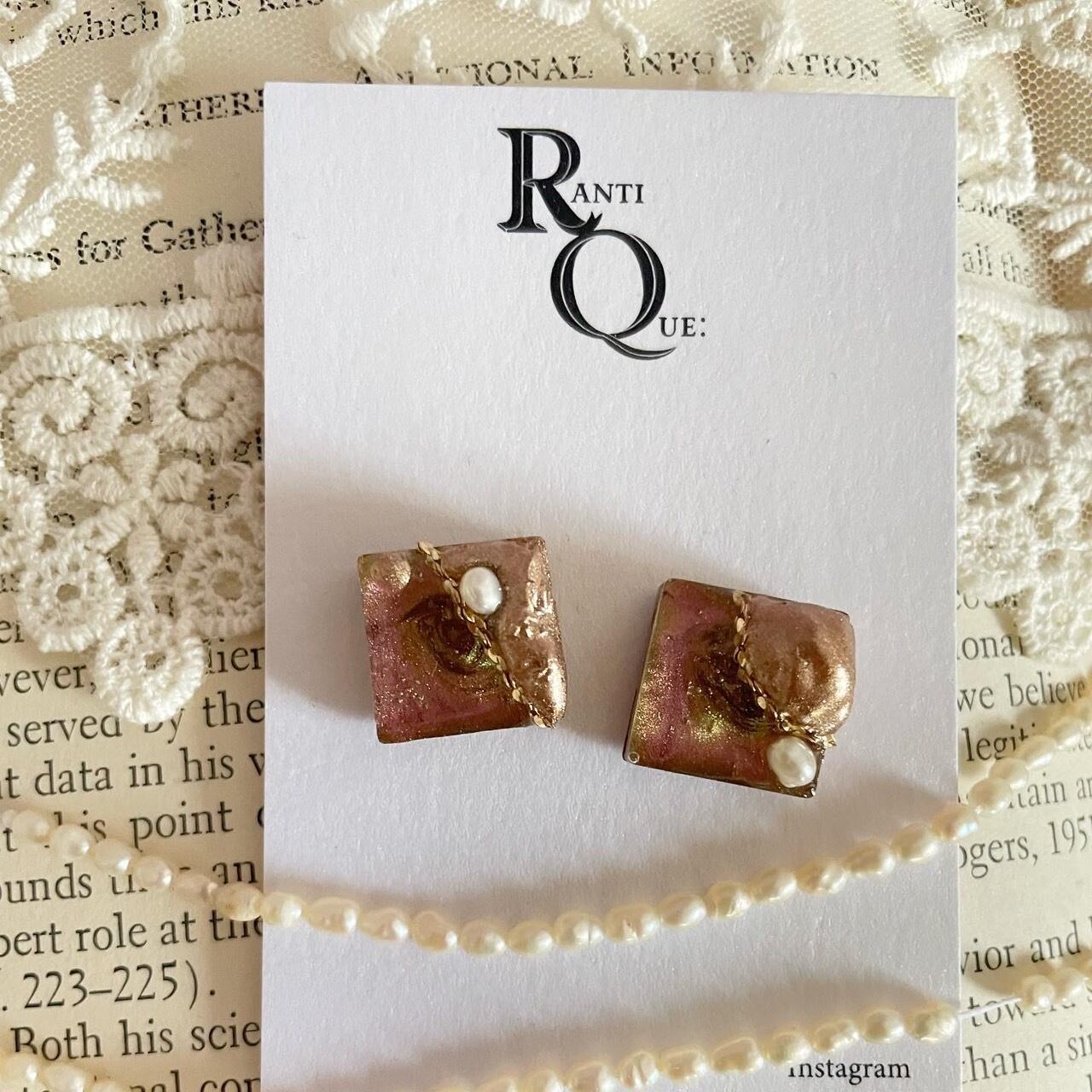 キラキラしたこっくりカラーの四角いベースに、淡水パールとぷっくりゴールドをのせて*